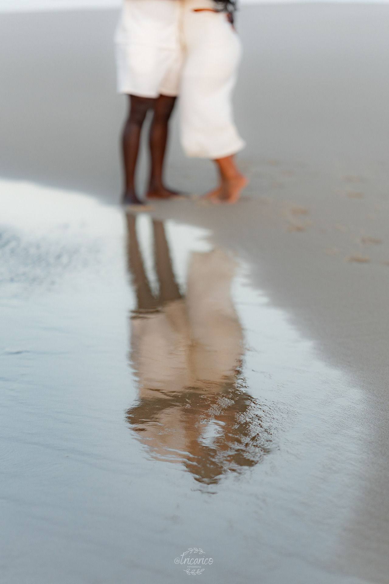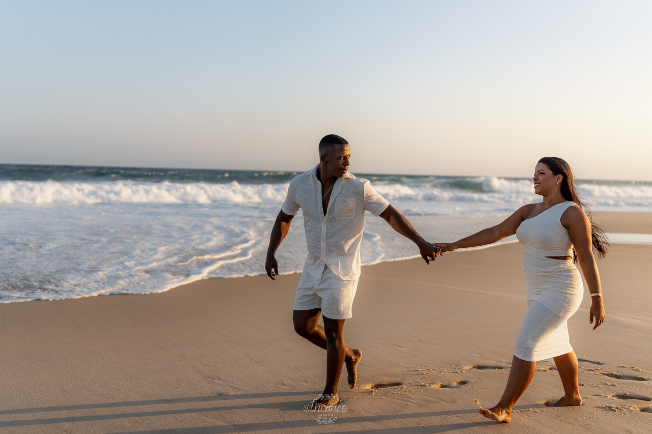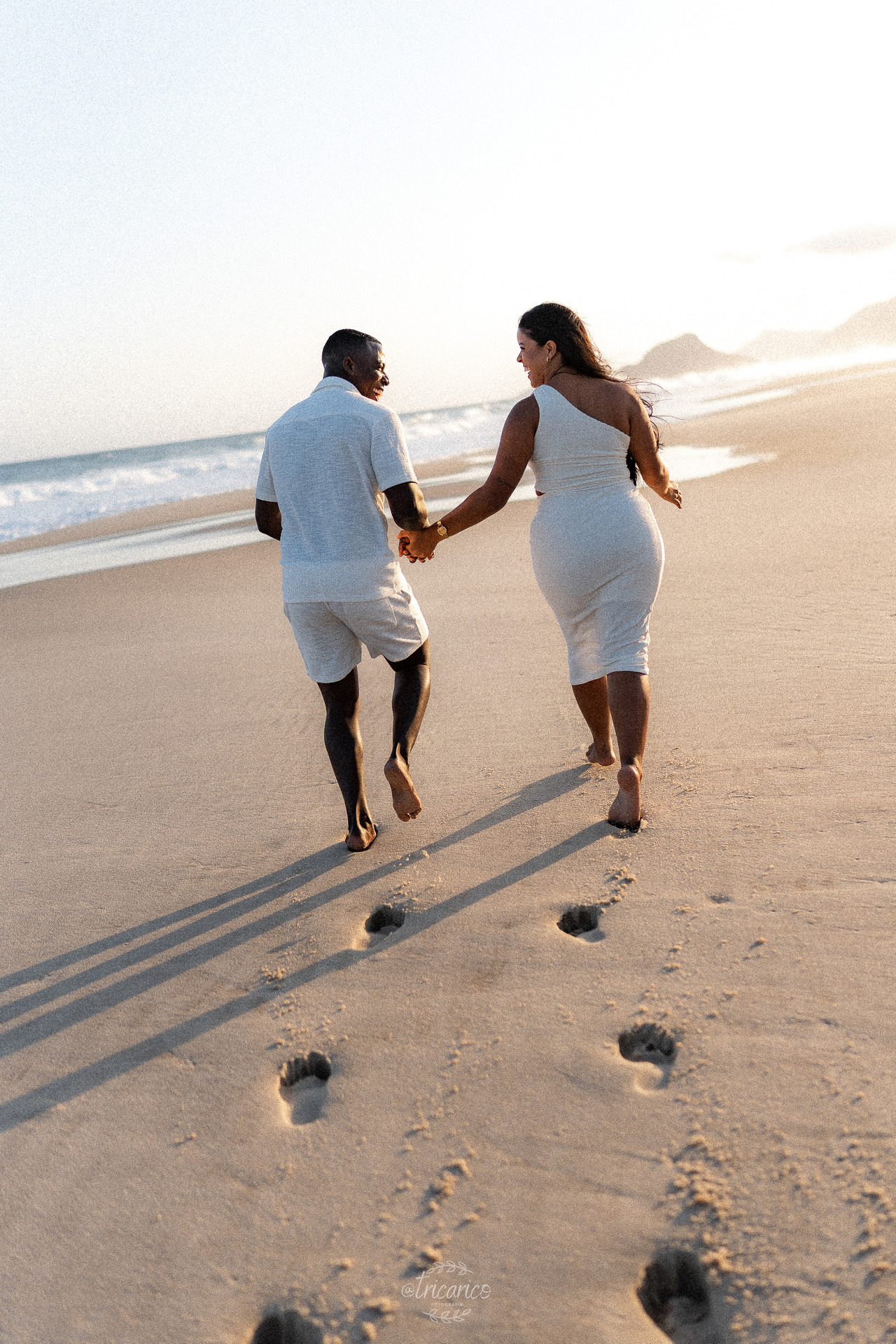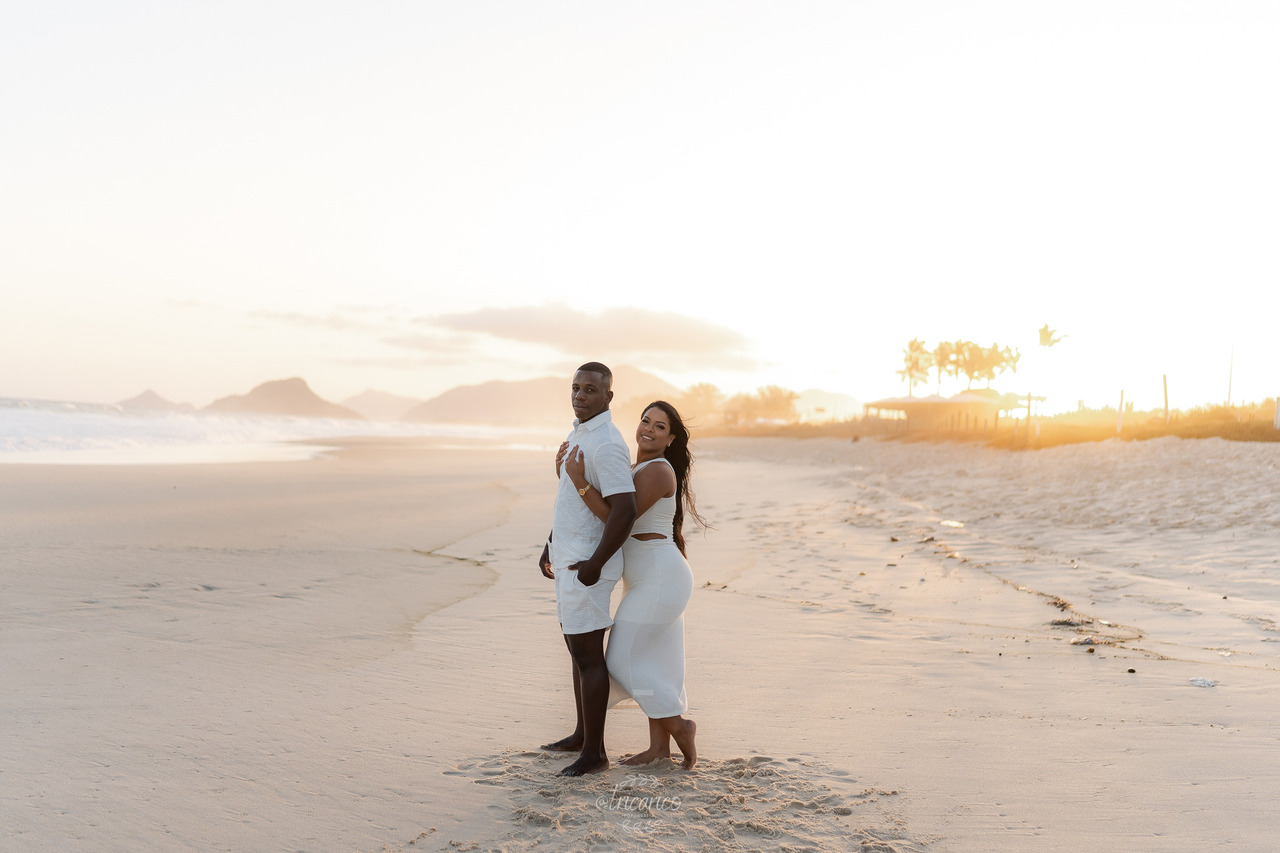 Na etapa final, o casal trocou de look: Raíza surgiu em um vestido branco que remetia à noiva, enquanto Matheus vestia roupas claras, perfeitas para o clima praiano. Foi na areia da Praia da Reserva que vivemos um dos momentos mais especiais do ensaio. O pôr do sol dourado iluminava o mar e criava uma atmosfera mágica, deixando cada clique ainda mais romântico e atemporal.