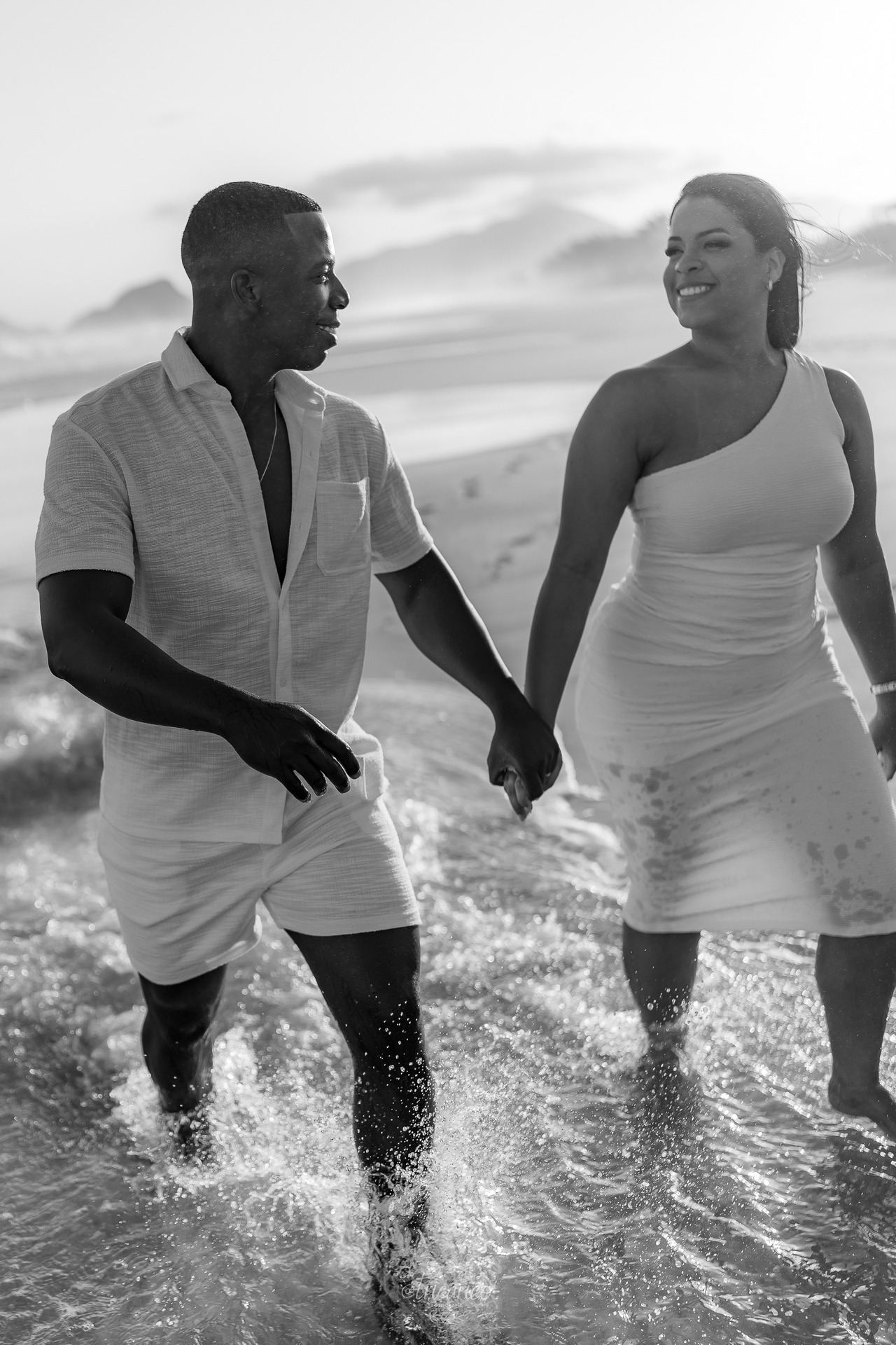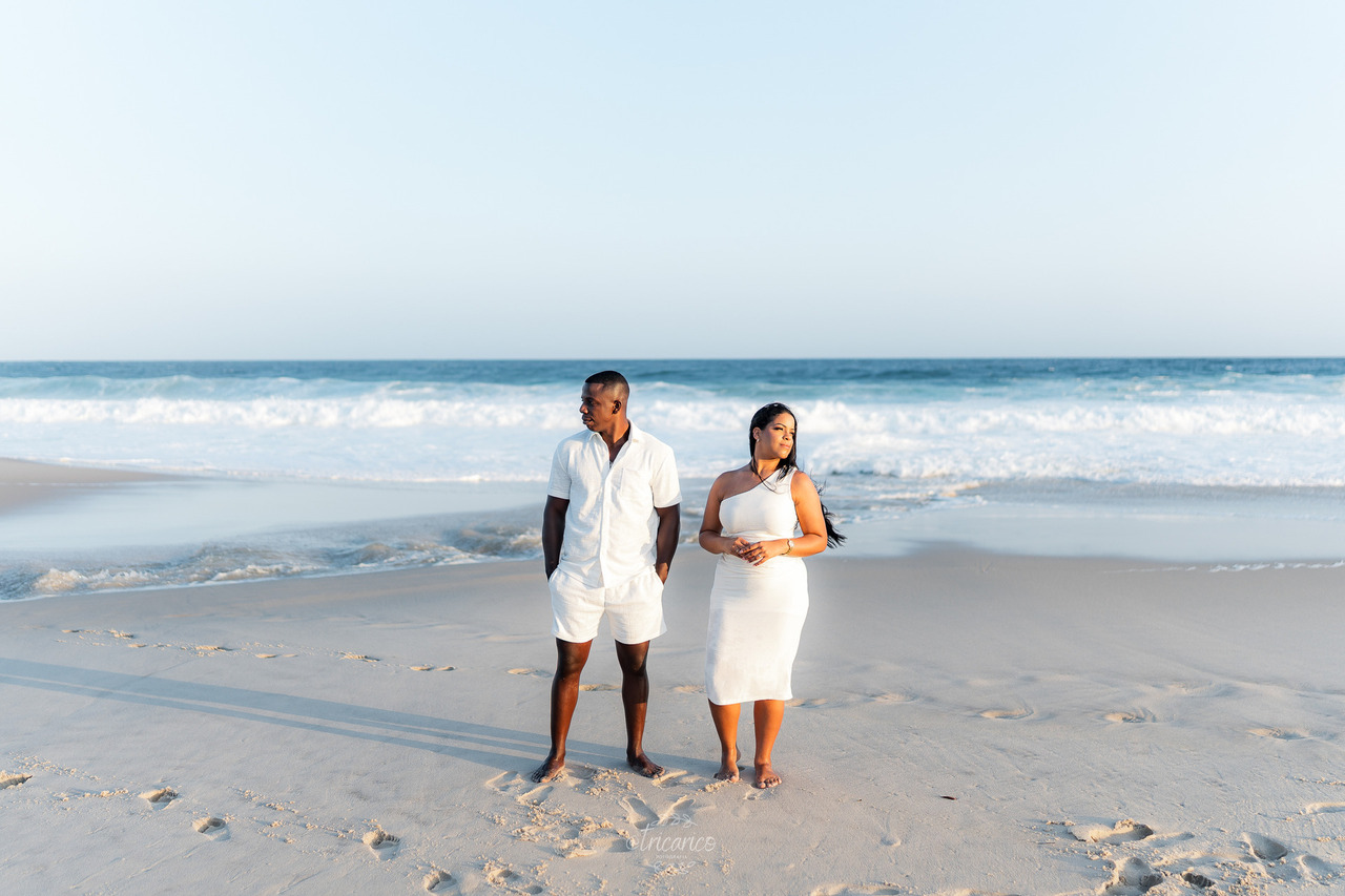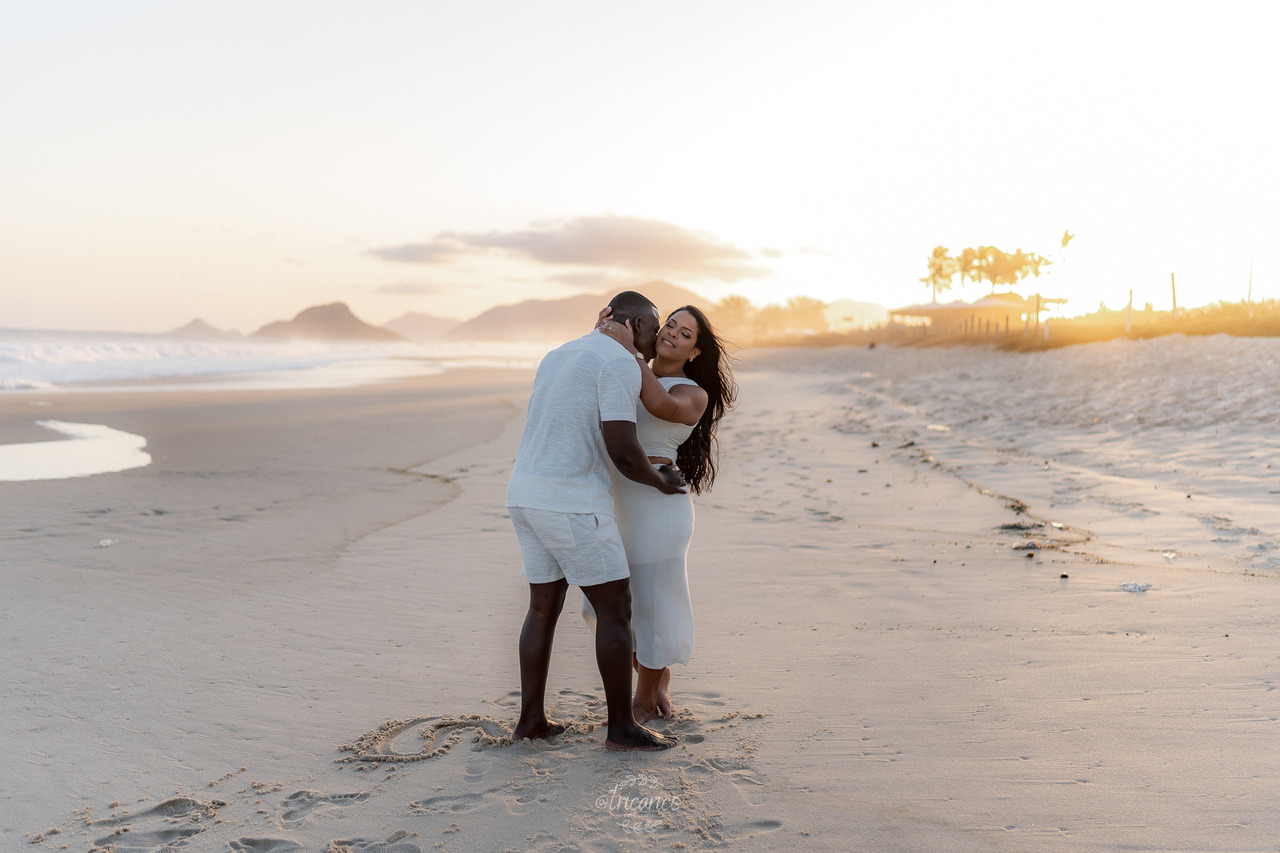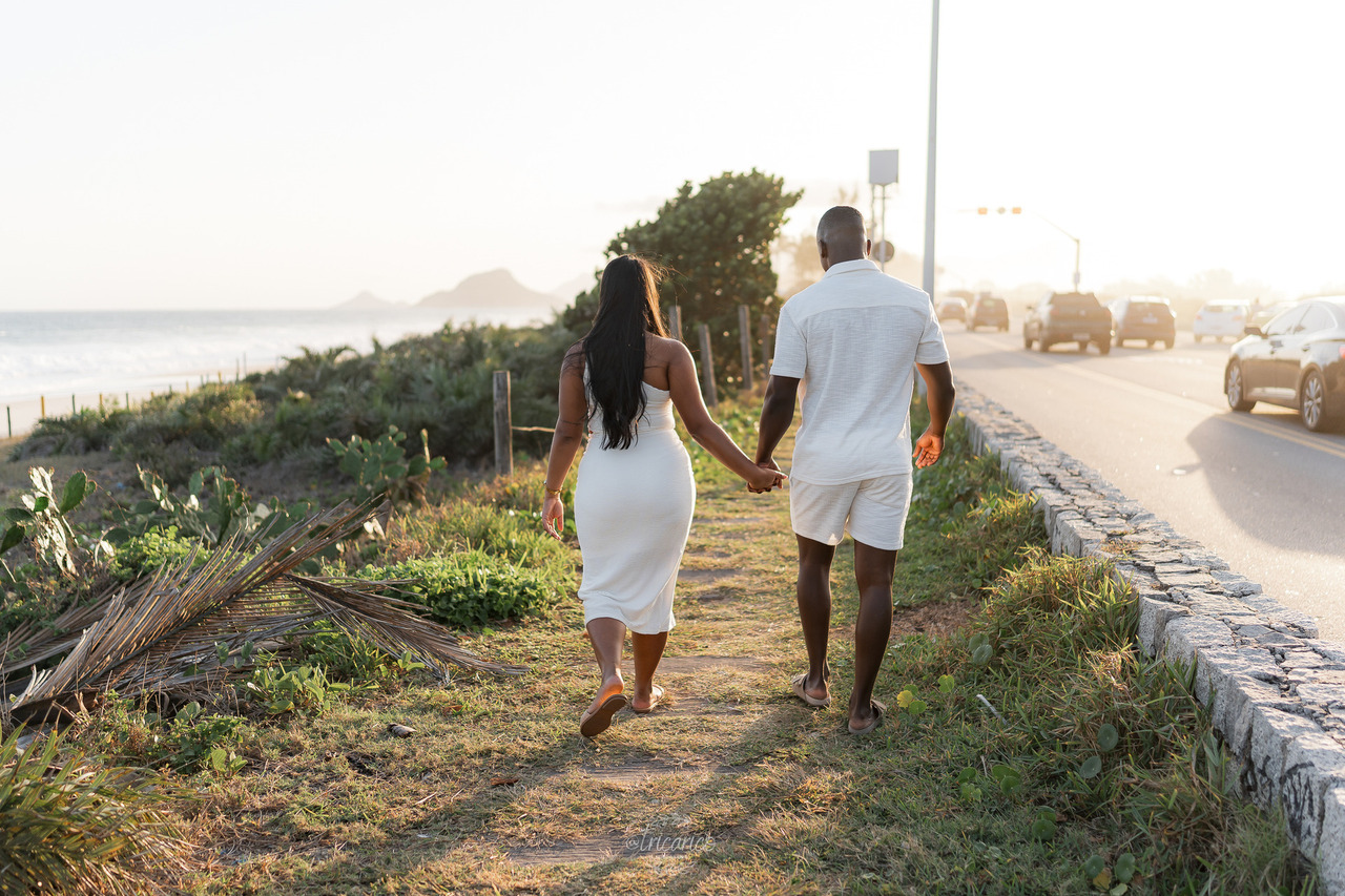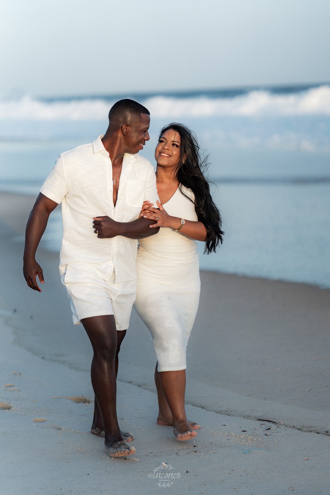 Na etapa final, o casal trocou de look: Raíza surgiu em um vestido branco que remetia à noiva, enquanto Matheus vestia roupas claras, perfeitas para o clima praiano. Foi na areia da Praia da Reserva que vivemos um dos momentos mais especiais do ensaio. O pôr do sol dourado iluminava o mar e criava uma atmosfera mágica, deixando cada clique ainda mais romântico e atemporal.