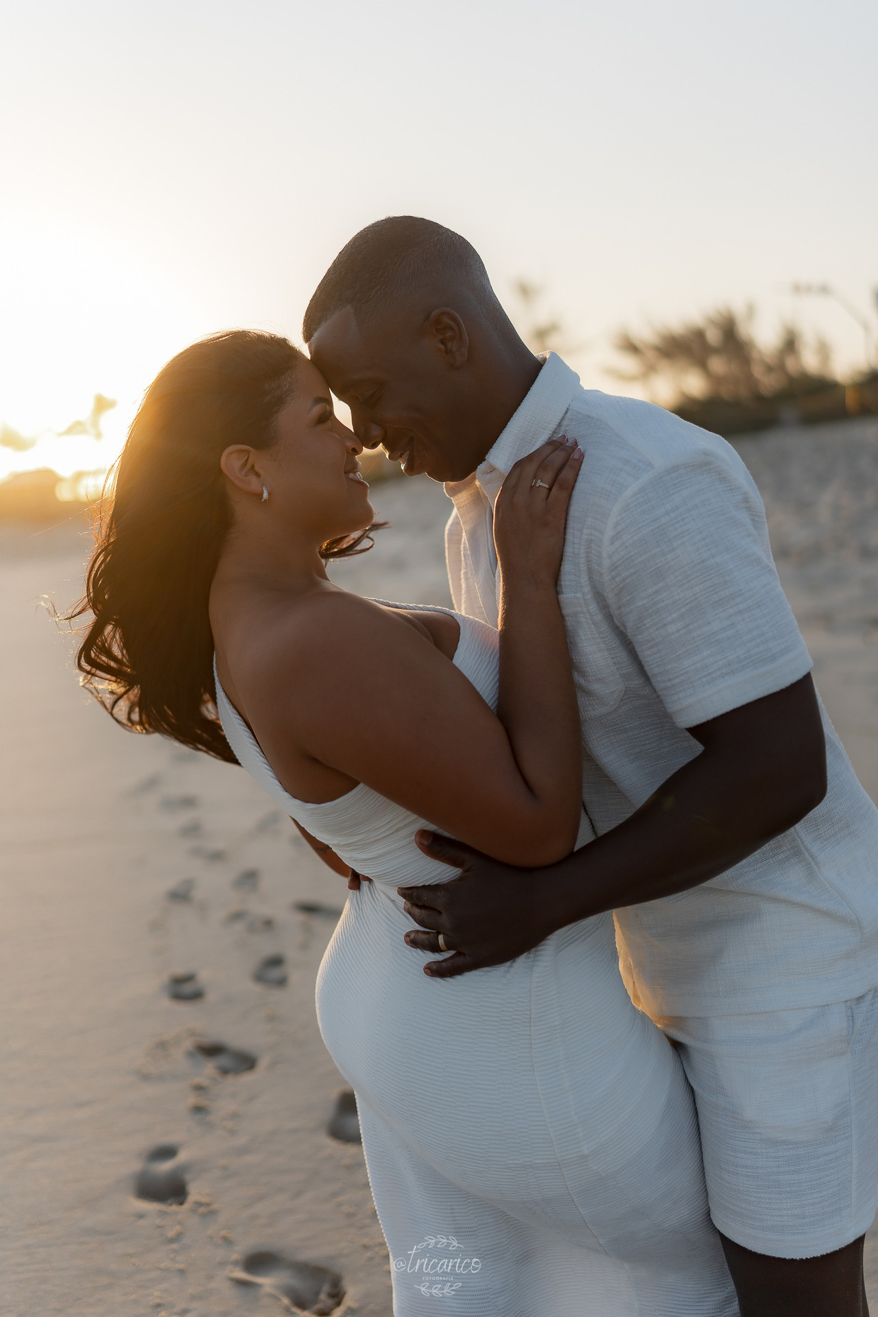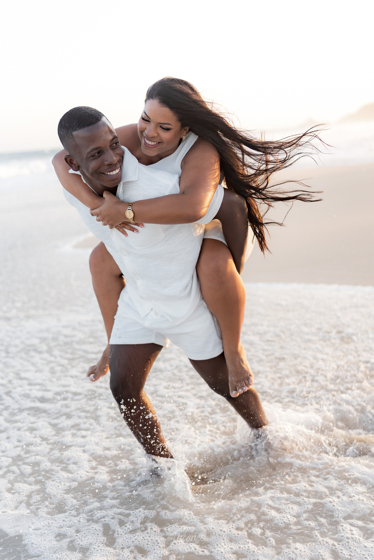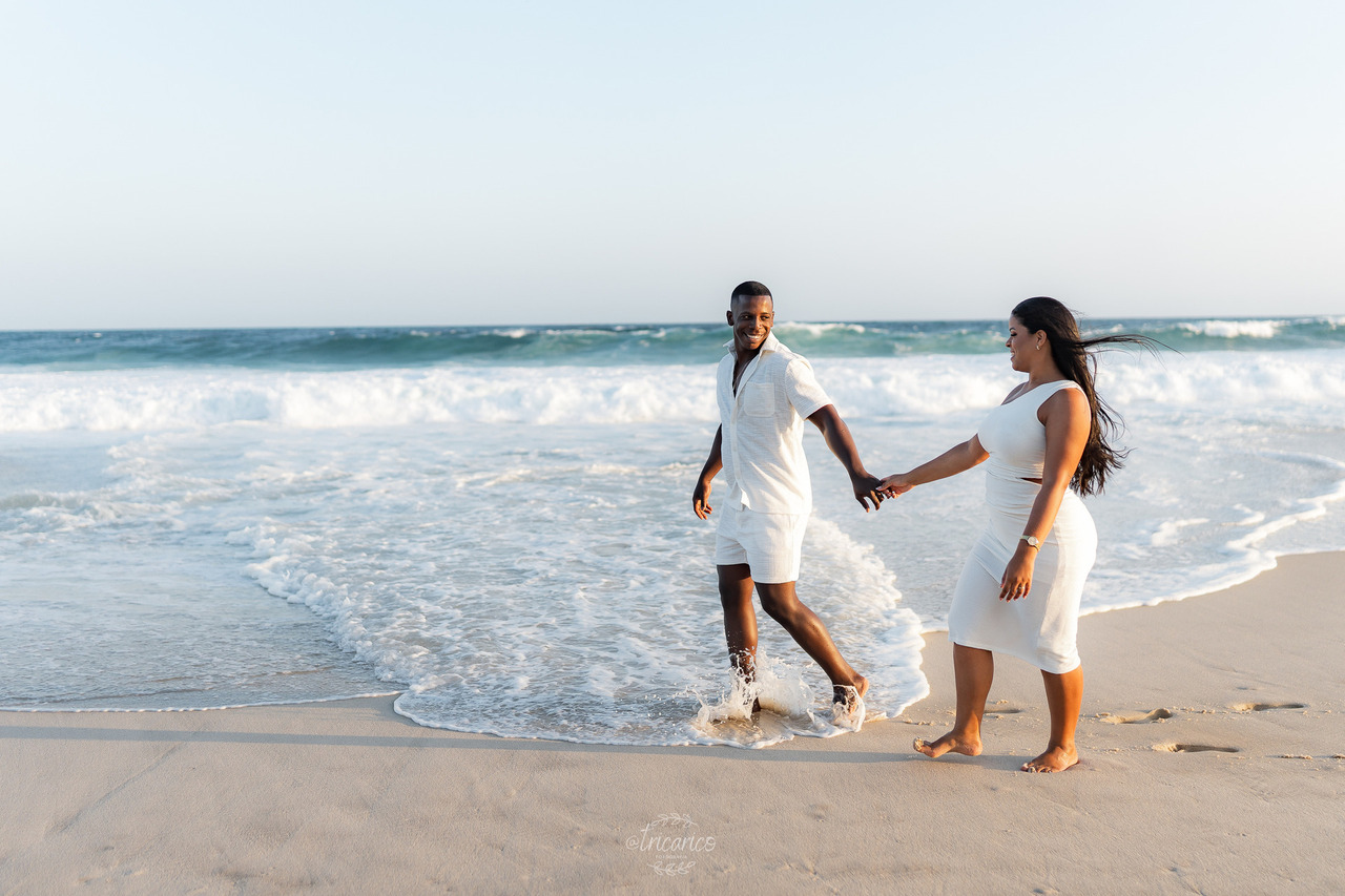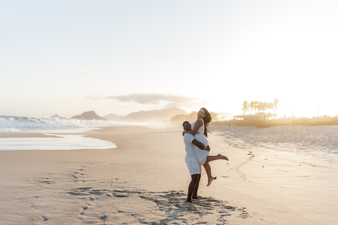 Na etapa final, o casal trocou de look: Raíza surgiu em um vestido branco que remetia à noiva, enquanto Matheus vestia roupas claras, perfeitas para o clima praiano. Foi na areia da Praia da Reserva que vivemos um dos momentos mais especiais do ensaio. O pôr do sol dourado iluminava o mar e criava uma atmosfera mágica, deixando cada clique ainda mais romântico e atemporal.