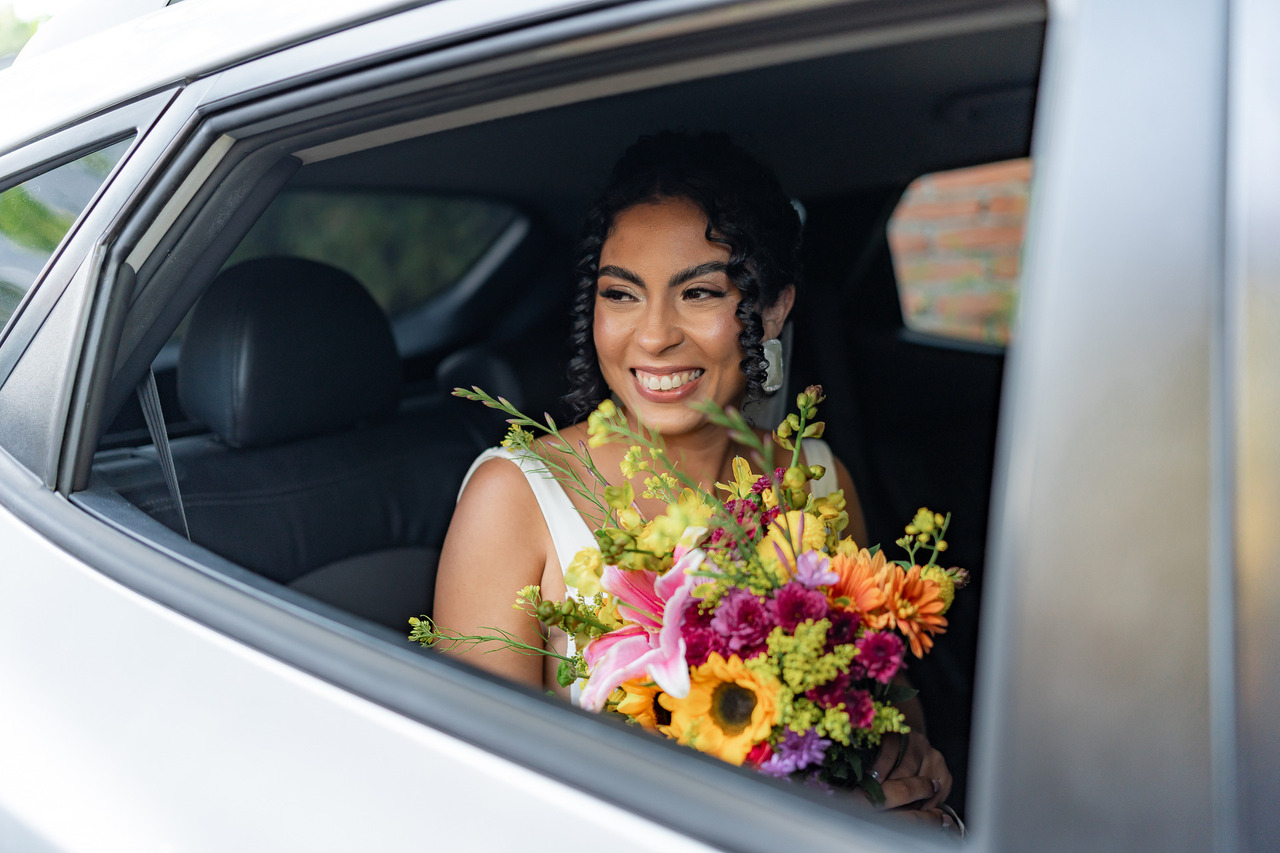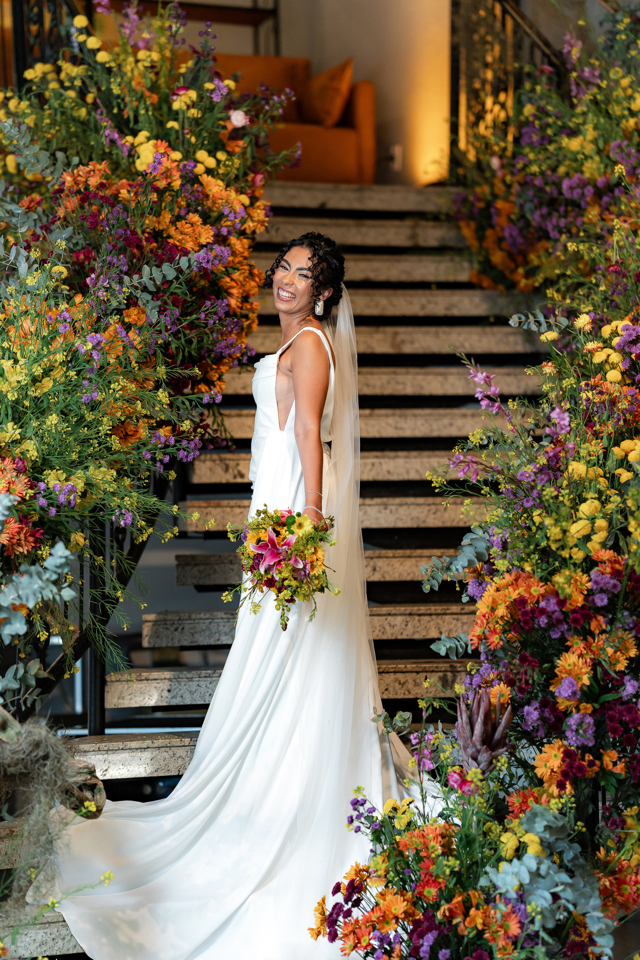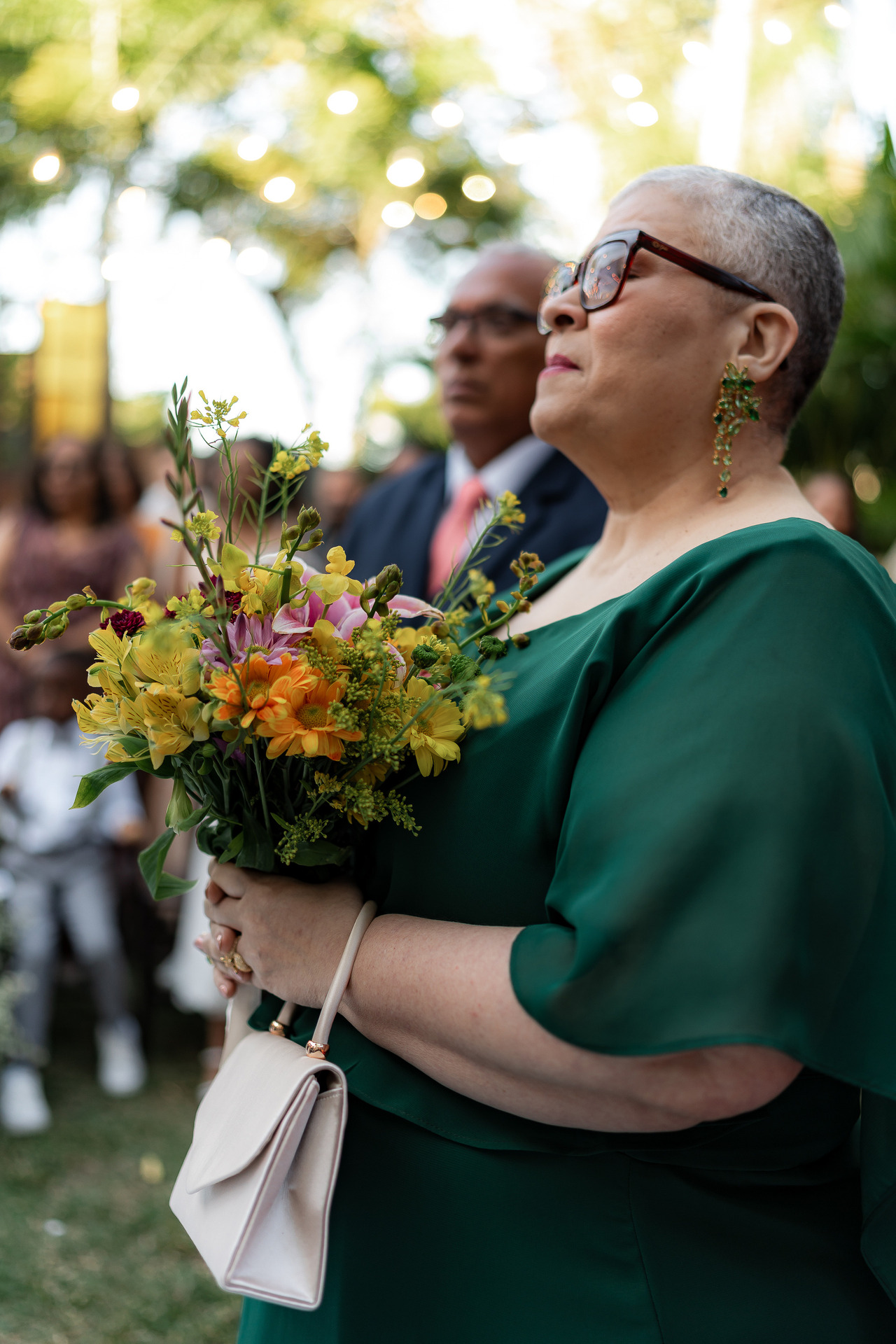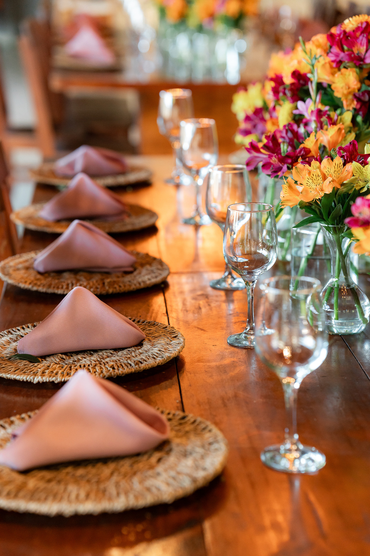 A natureza presenteou os noivos e convidados com um céu dourado incrível, que iluminava a cerimônia cercada por flores de primavera em tons vivos. O clima rústico e delicado, unido ao buquê colorido da Letícia, trouxe ainda mais vida e personalidade à celebração.