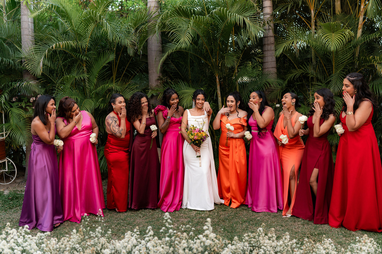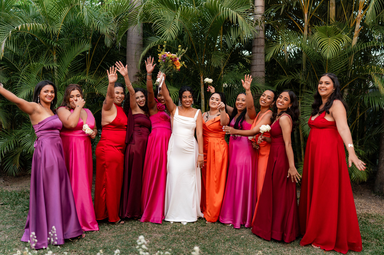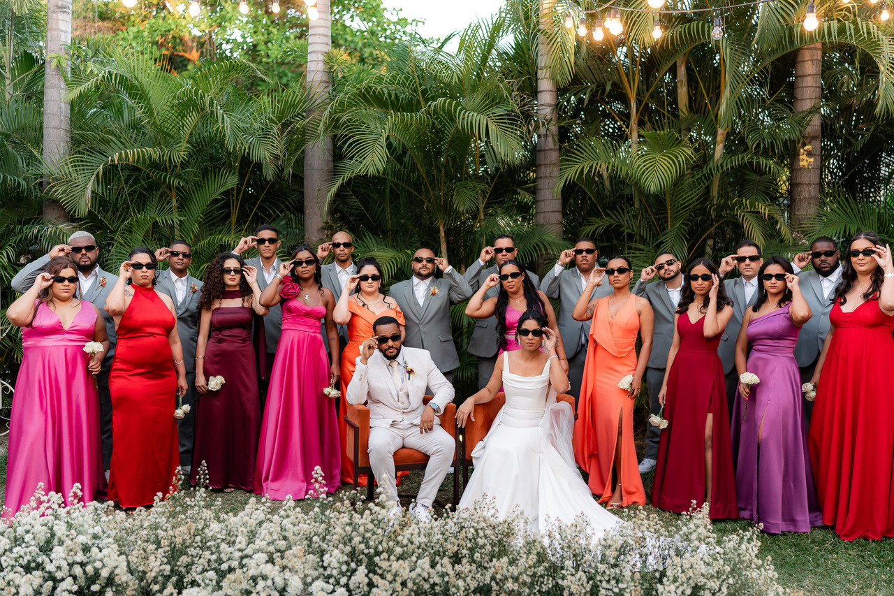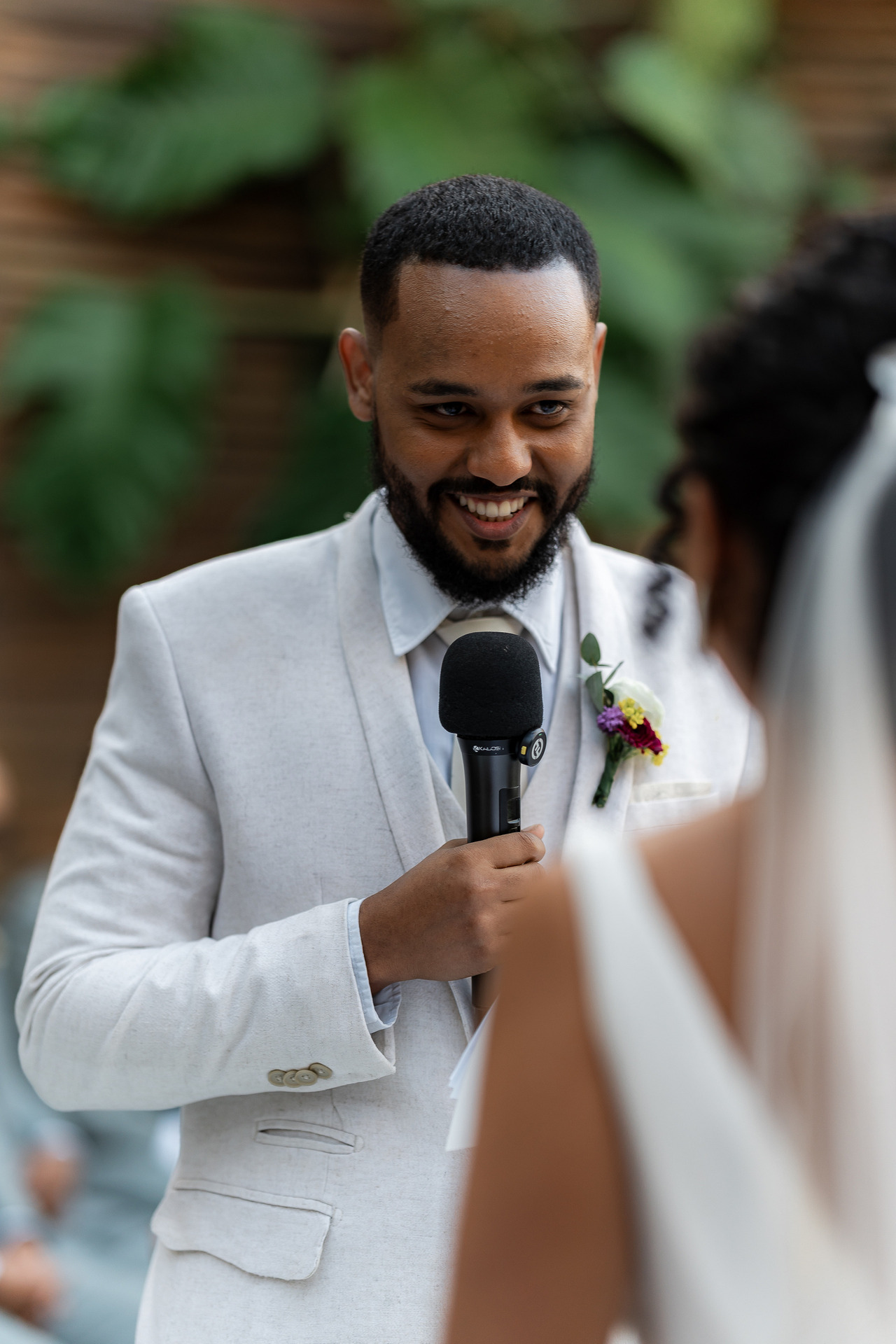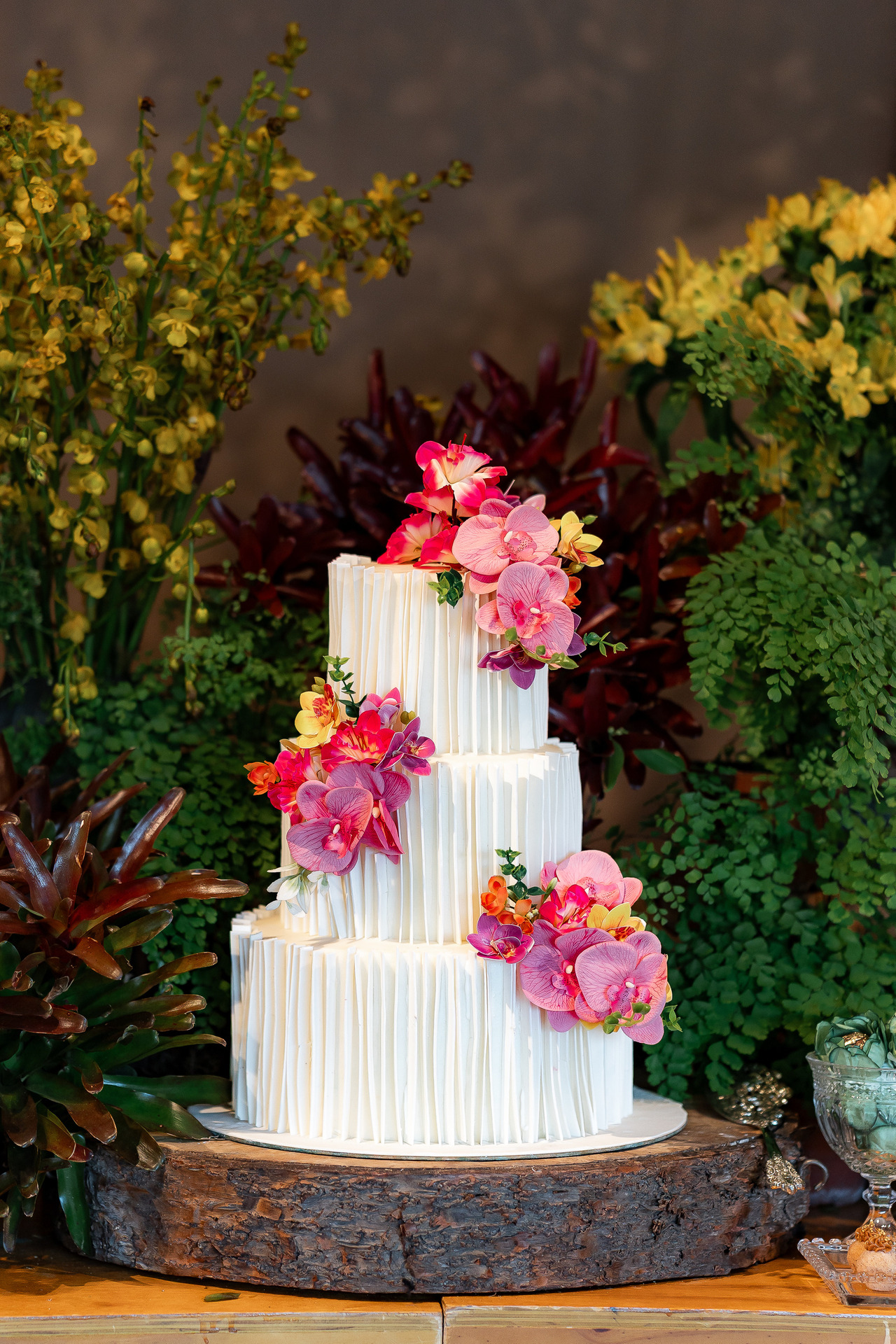 A natureza presenteou os noivos e convidados com um céu dourado incrível, que iluminava a cerimônia cercada por flores de primavera em tons vivos. O clima rústico e delicado, unido ao buquê colorido da Letícia, trouxe ainda mais vida e personalidade à celebração.