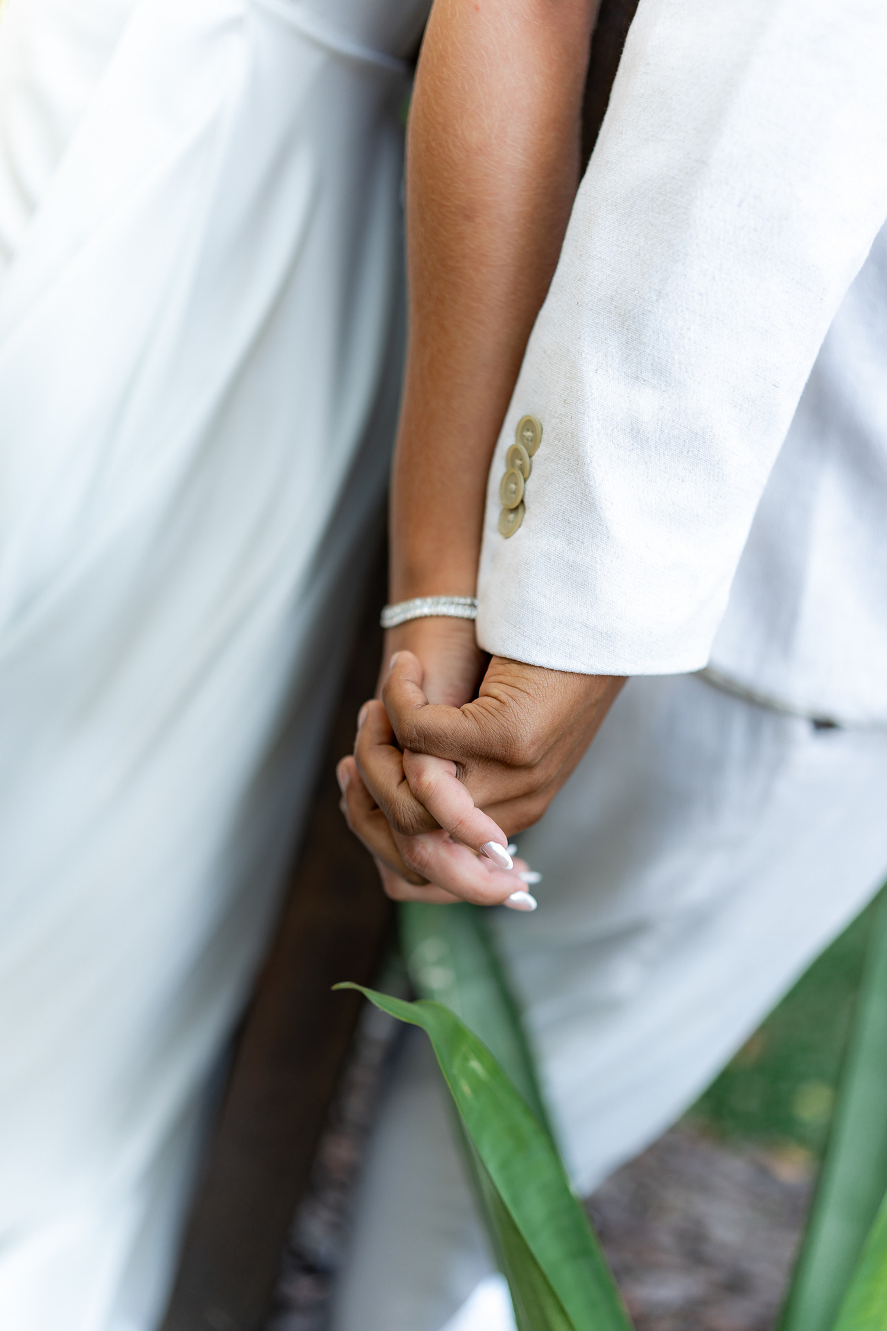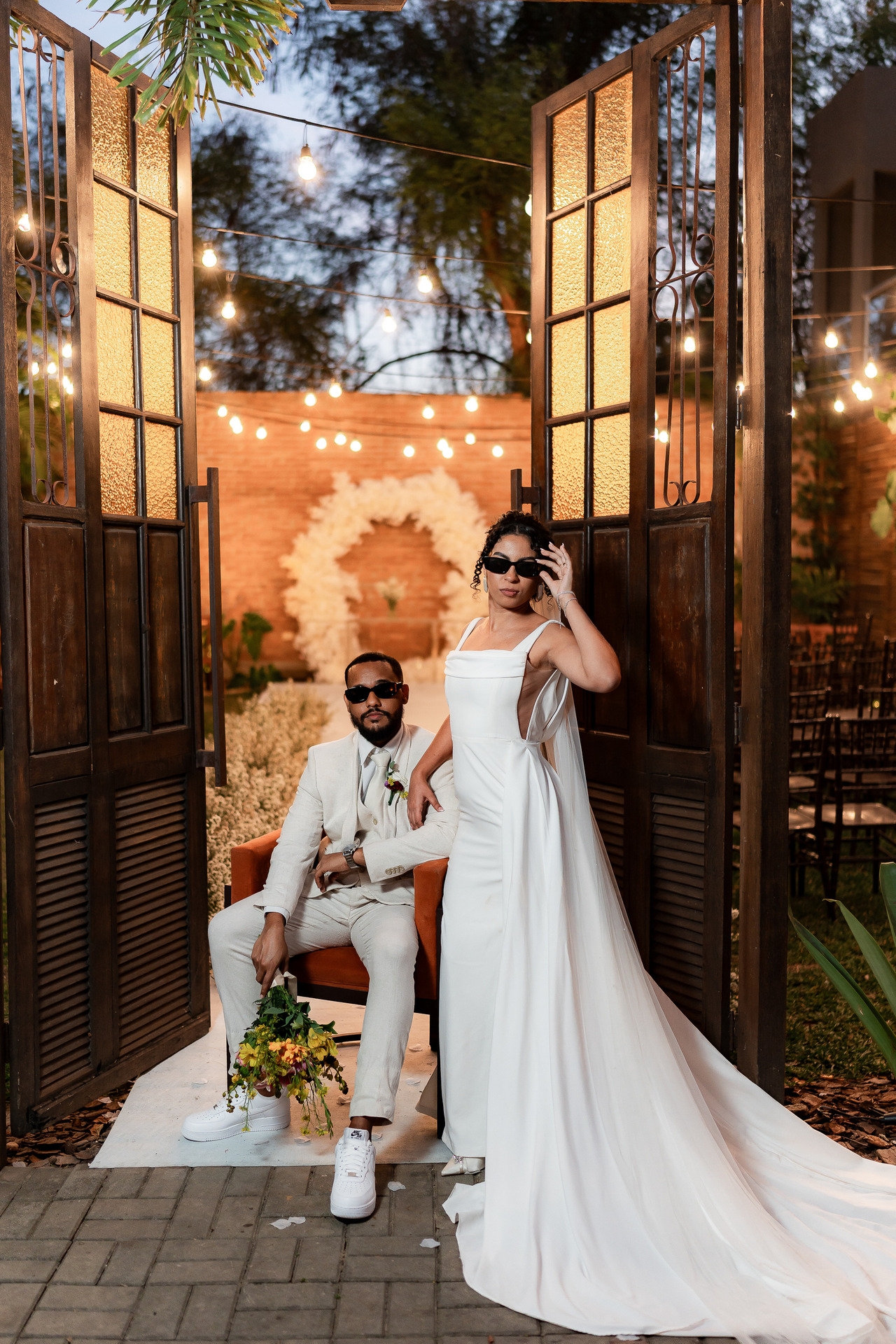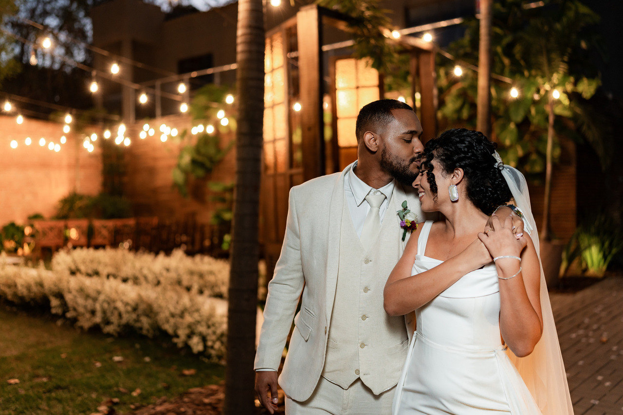 Após a cerimônia, seguimos para o ensaio do casal. Já era início da noite e o céu azul do crepúsculo trouxe uma atmosfera única e romântica. Mesmo após o pôr do sol, as fotos ganharam ainda mais intensidade, refletindo a conexão verdadeira entre Letícia e Caio.