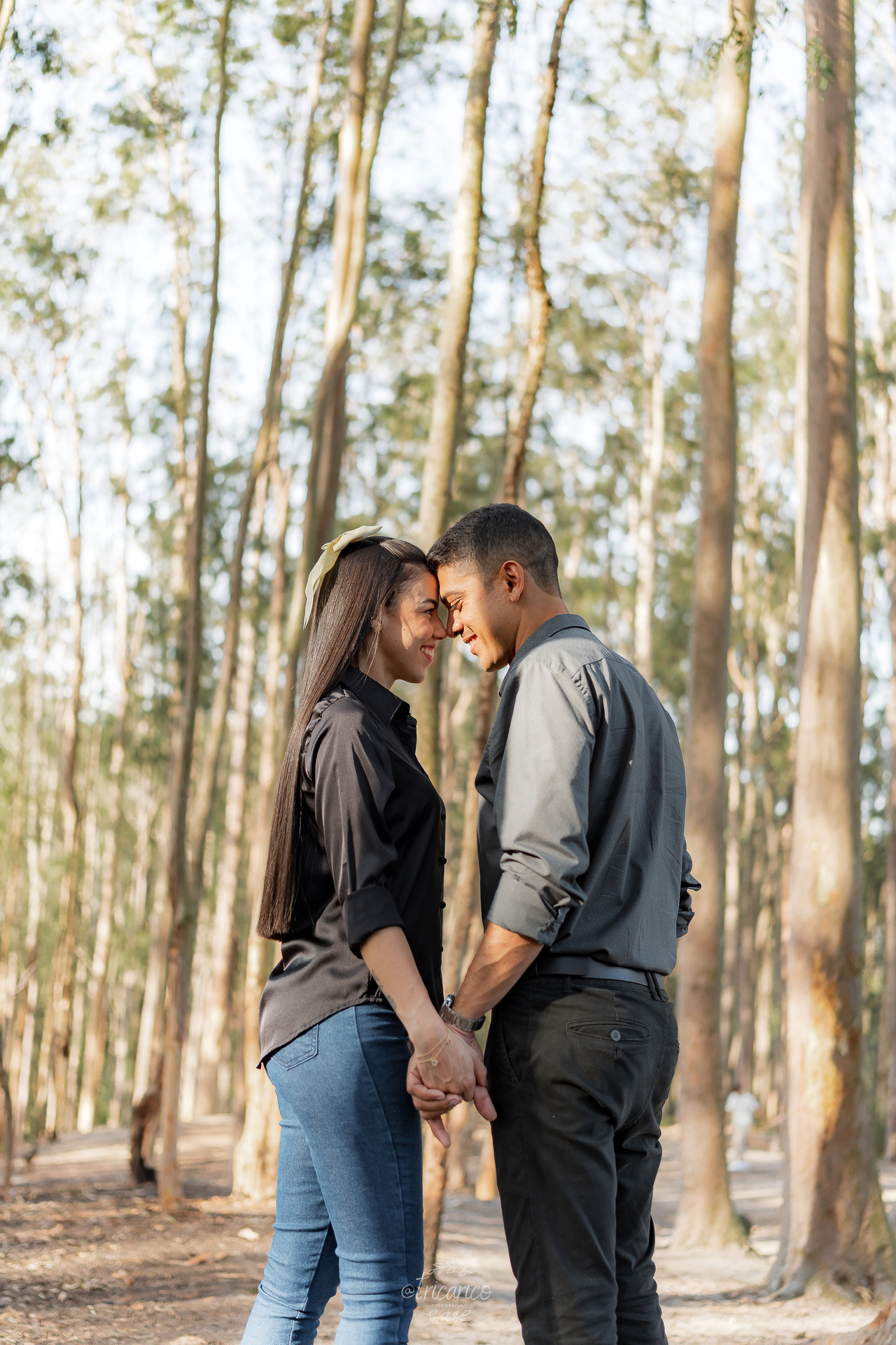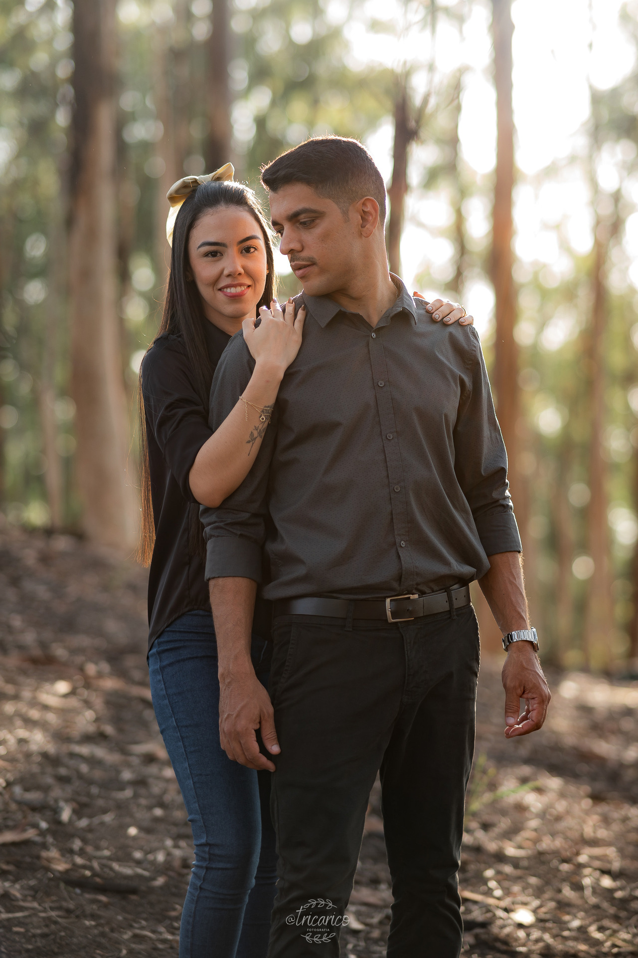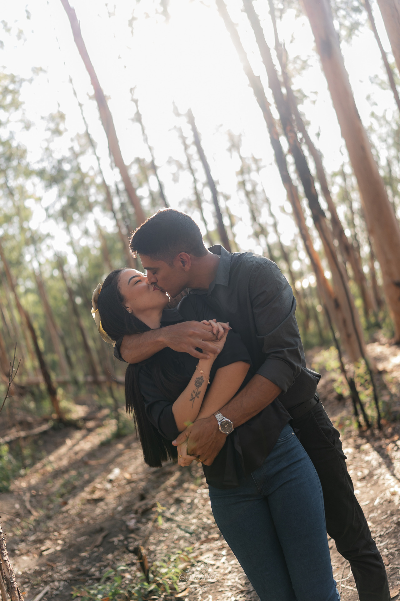 Antes desse momento, registramos também a primeira parte do ensaio, onde o casal escolheu looks pretos e jeans. O contraste com a natureza criou uma atmosfera intimista, quase cinematográfica, lembrando a estética envolvente de Crepúsculo. Ali, a força dos tons escuros dialogava com a intensidade da relação, resultando em composições minimalistas e detalhistas.