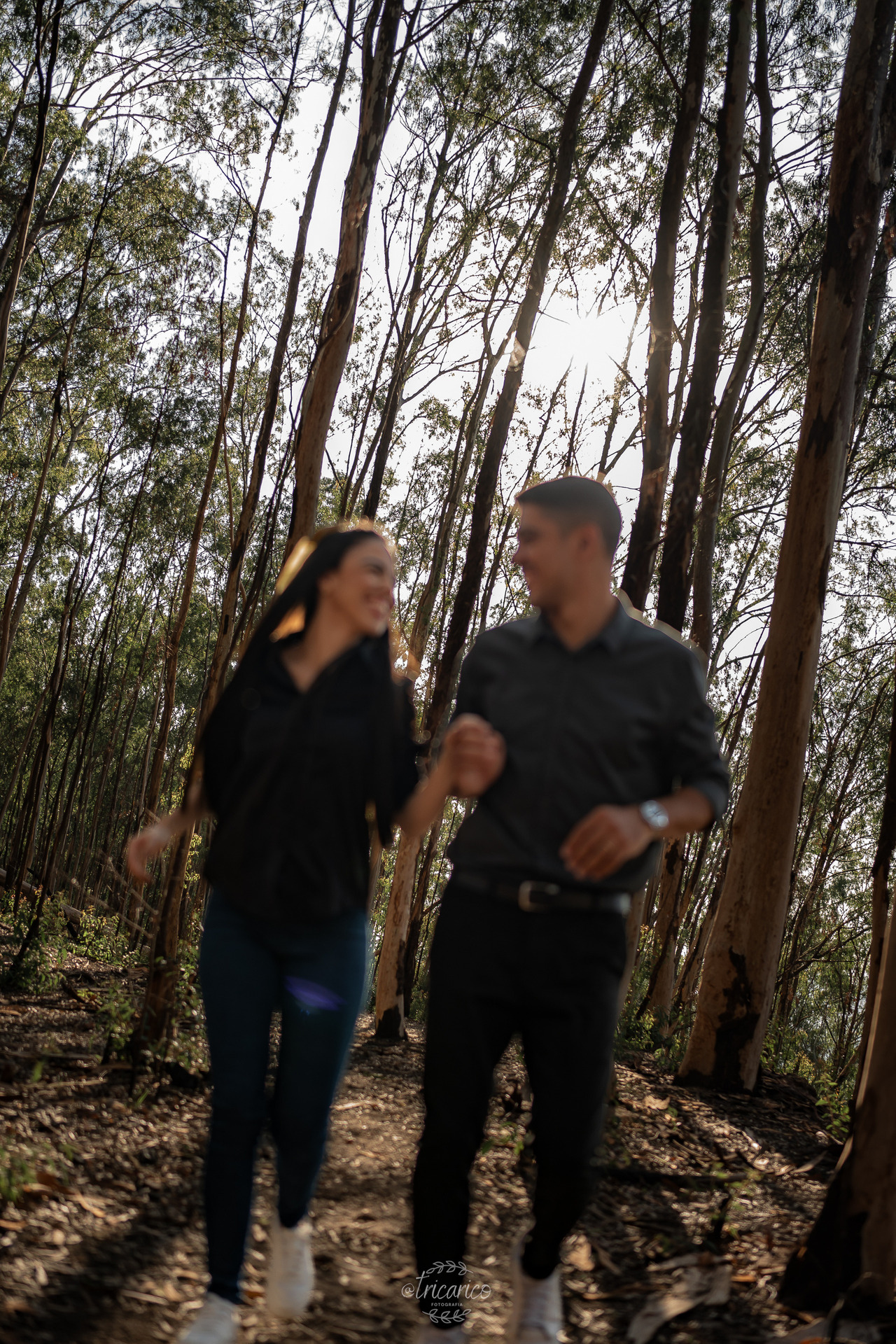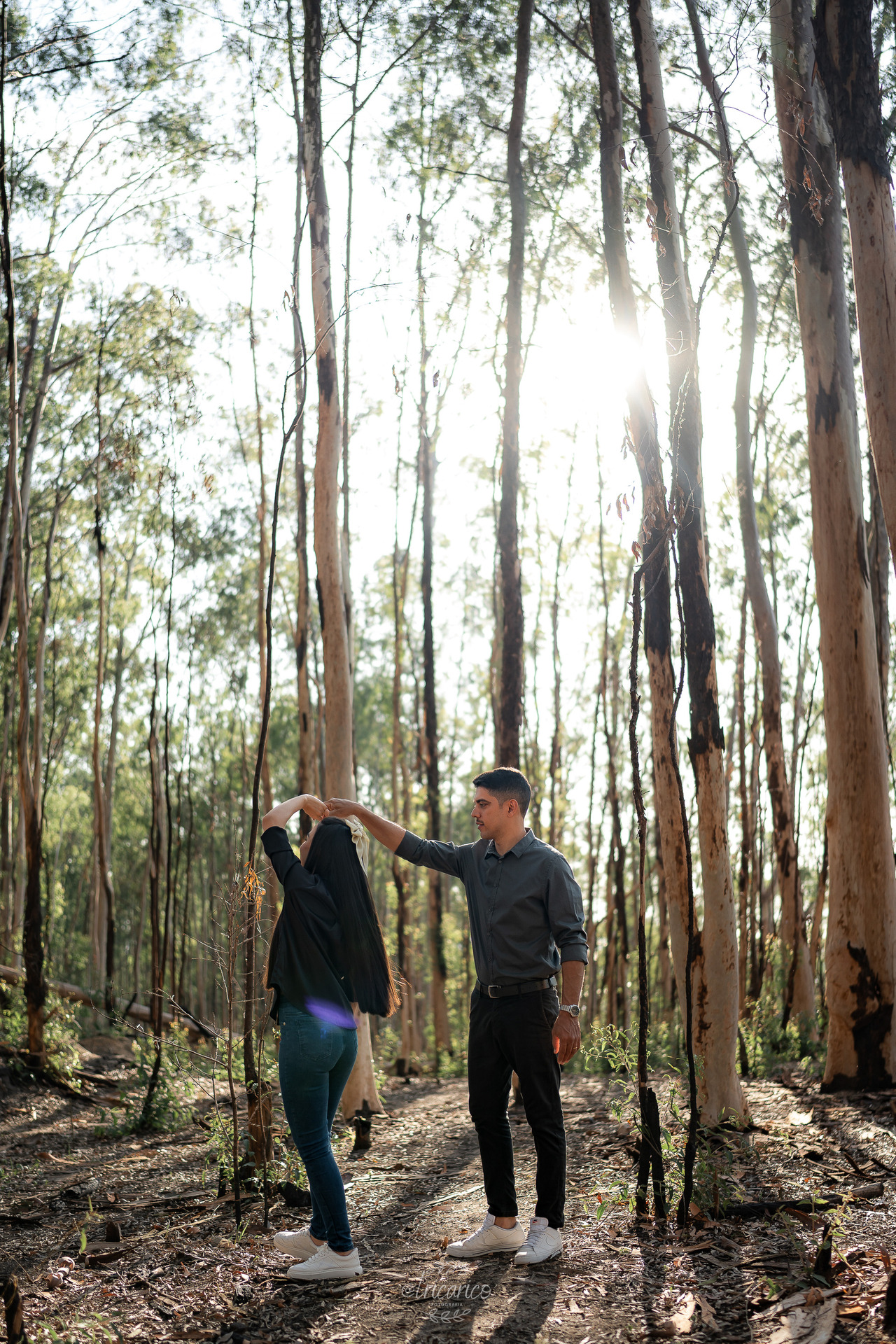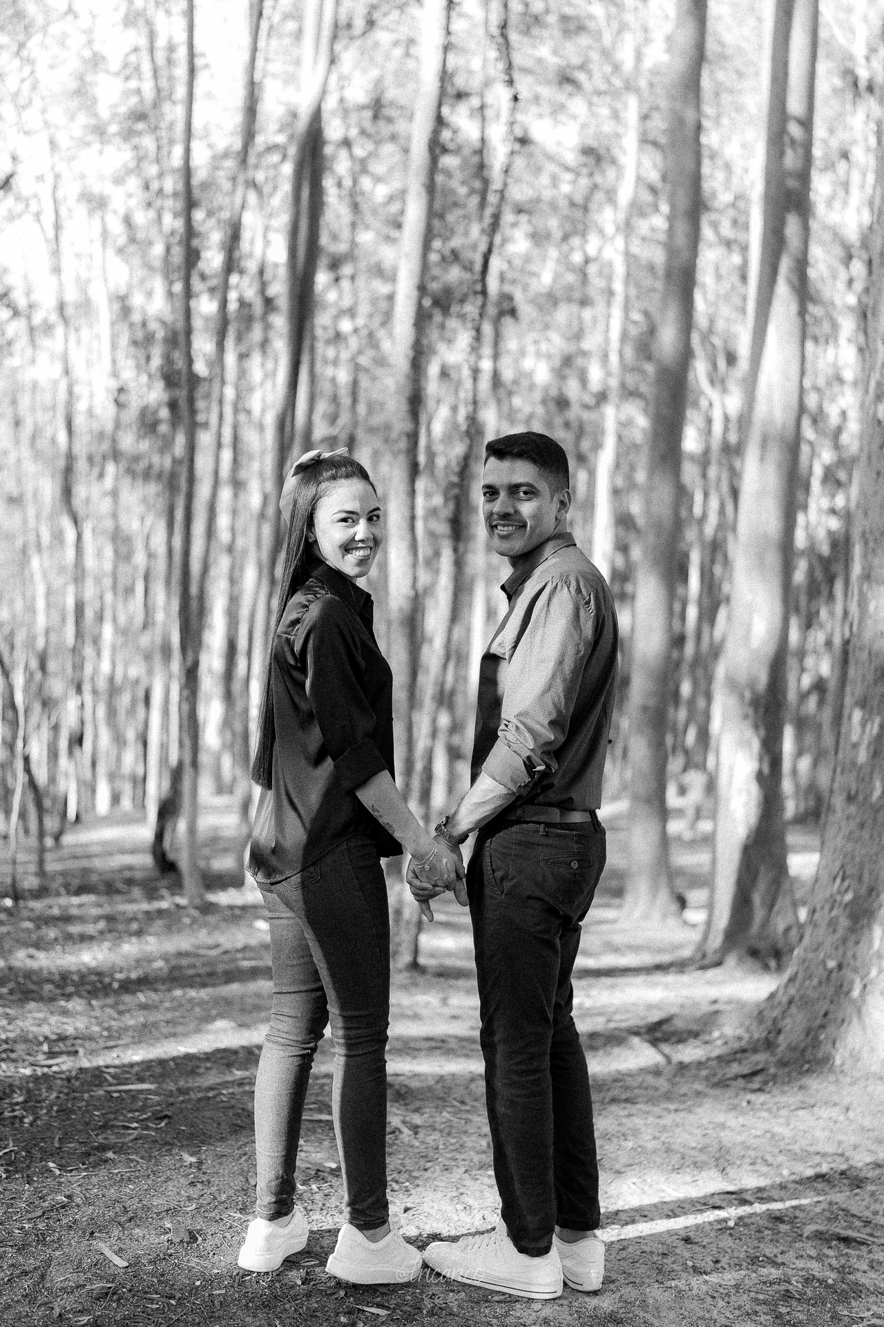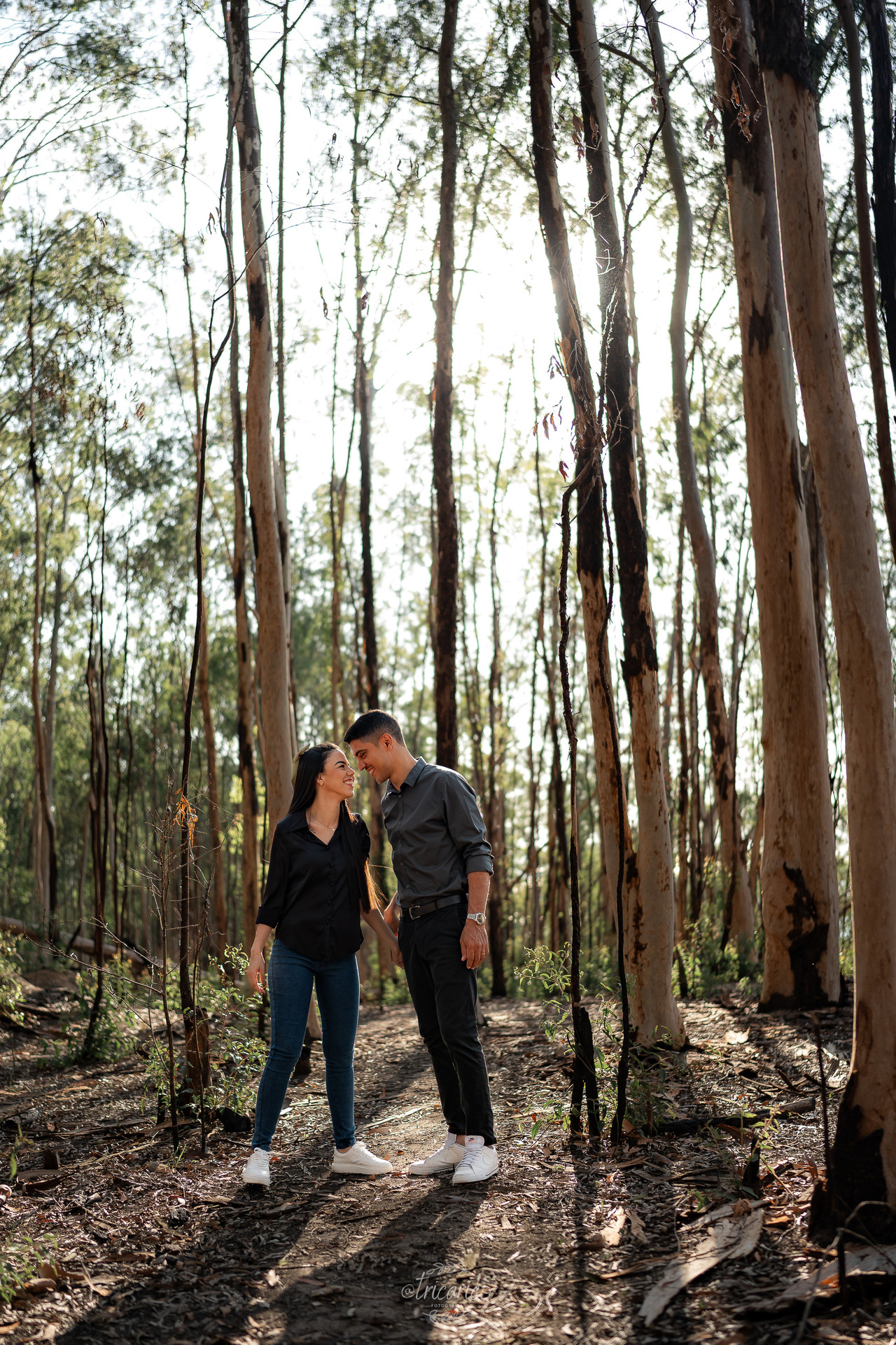 Antes desse momento, registramos também a primeira parte do ensaio, onde o casal escolheu looks pretos e jeans. O contraste com a natureza criou uma atmosfera intimista, quase cinematográfica, lembrando a estética envolvente de Crepúsculo. Ali, a força dos tons escuros dialogava com a intensidade da relação, resultando em composições minimalistas e detalhistas.