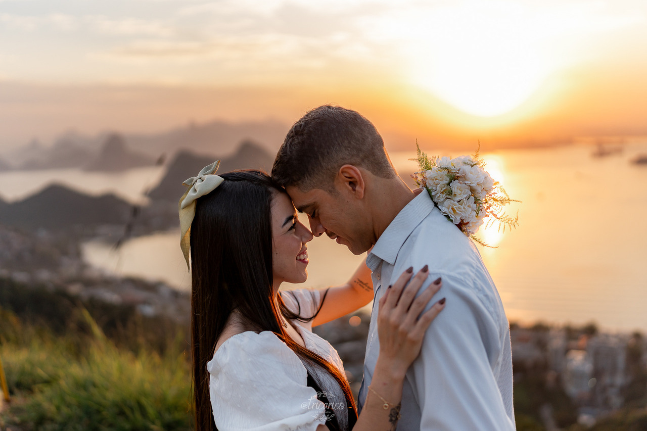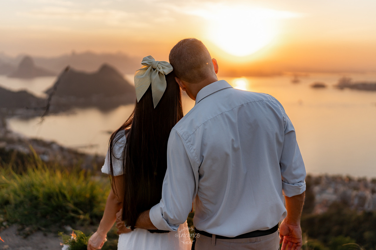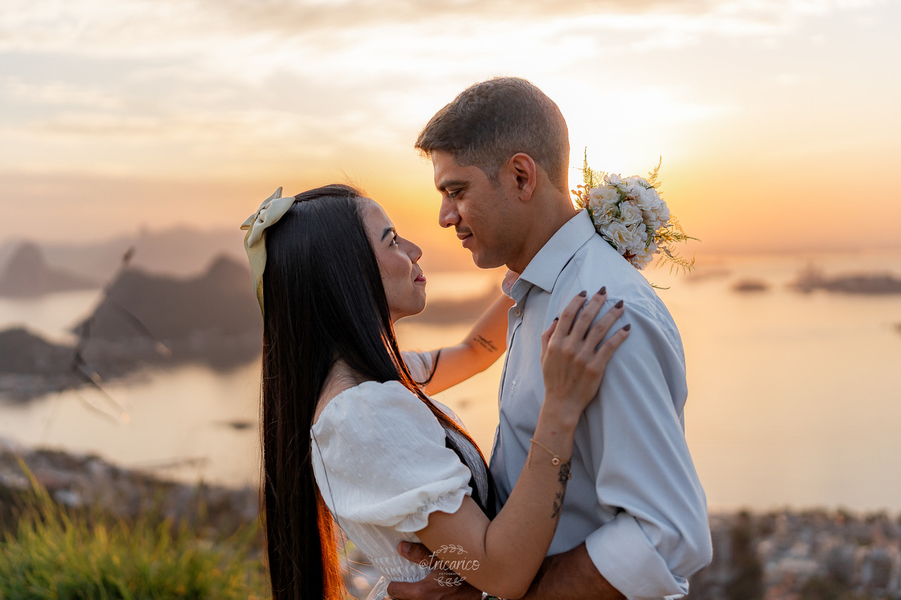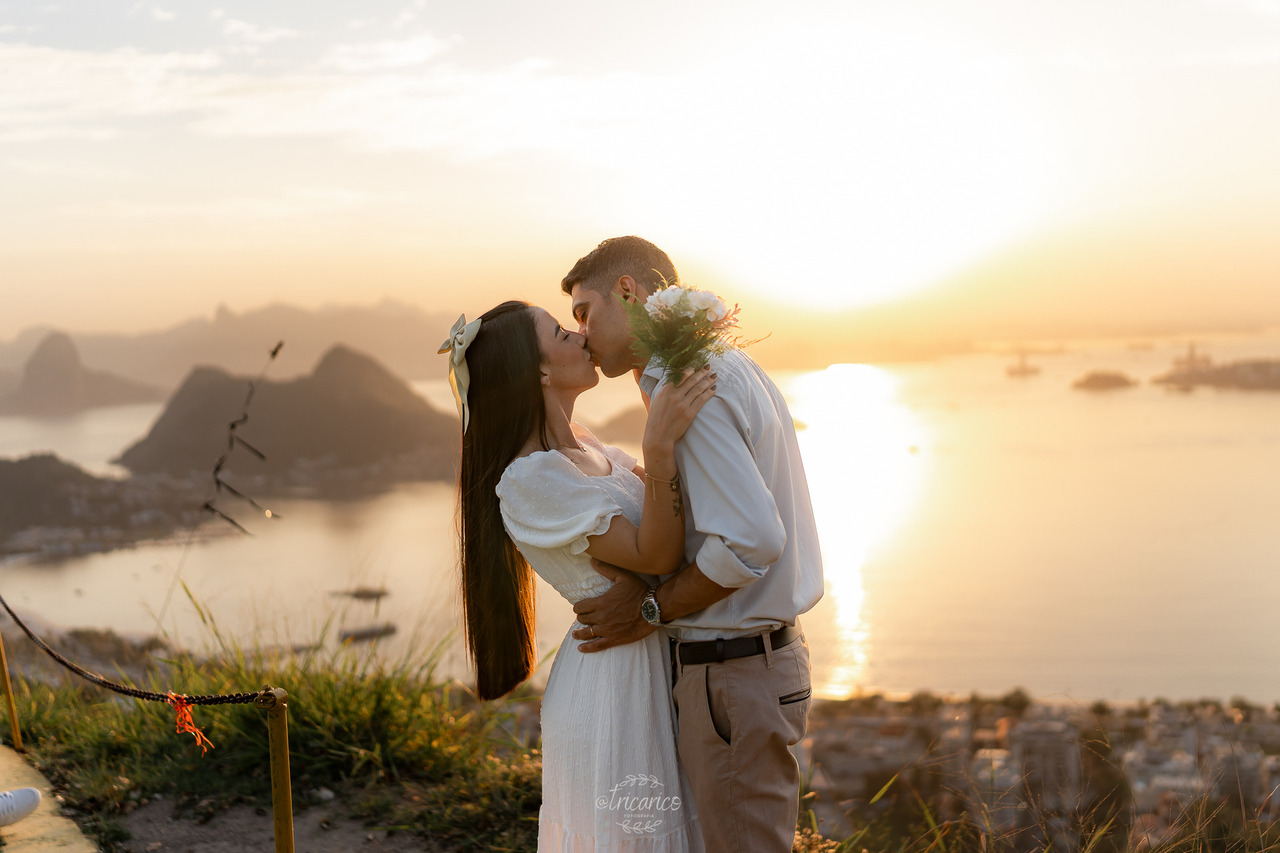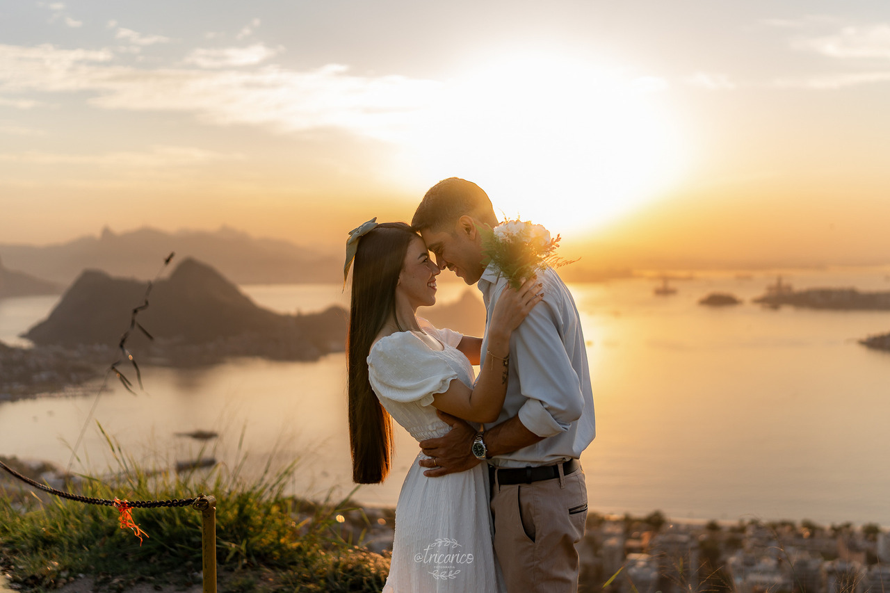 Para encerrar, seguimos até o mirante, de onde se revela uma vista espetacular de todo o Rio de Janeiro. O pôr do sol dourado somado à energia de Tamara e Fábio completou esse pré-wedding inesquecível, onde cada clique une os quatro pilares da Tricarico Fotografia: elevado, elegante, minimalista e detalhista.